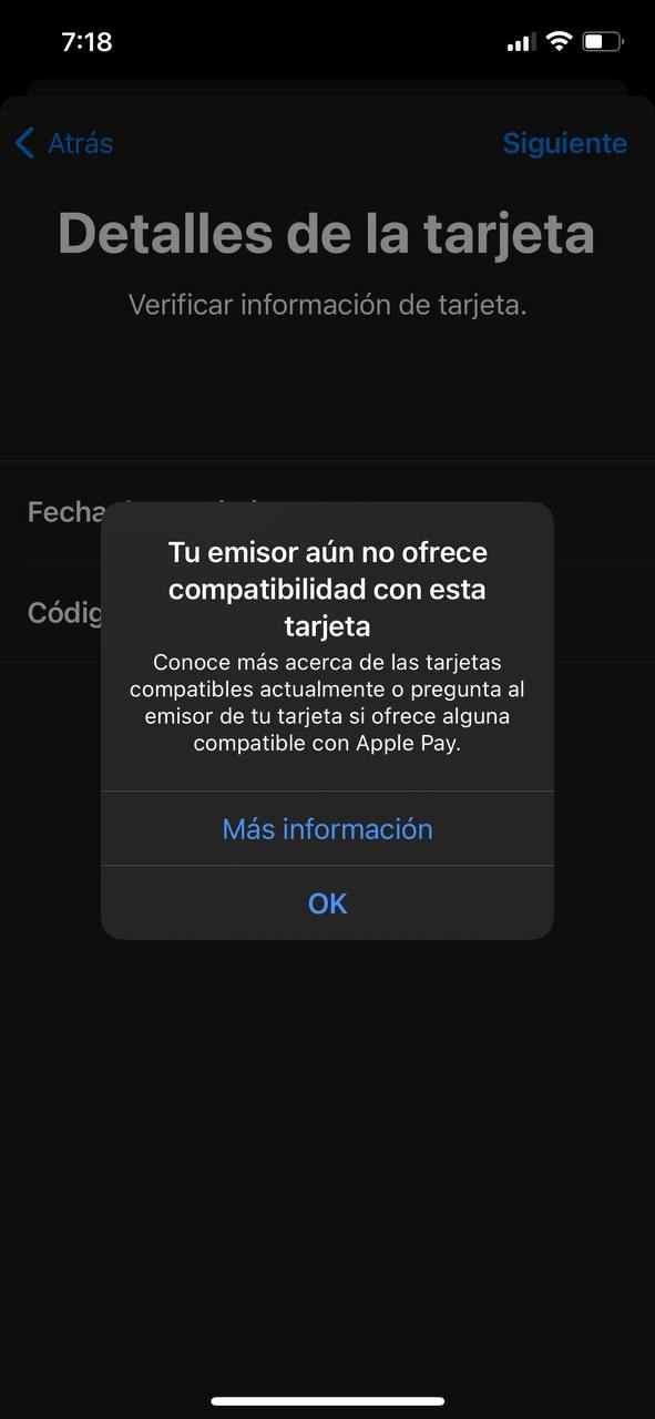 En nuestro caso hemos intentado agregar una tarjeta de débito de BBVA y se menciona que de momento la entidad financiera no soporta Apple Pay.